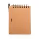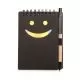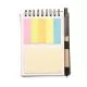 Bloco de anotações ecológico com caneta de papelão. Possui um detalhe “smile” na capa frontal (com o verso liso), e a caneta é ecológica, com acabamentos em plástico e acionada por clique. A primeira folha (branca) contém cinco blocos autoadesivos coloridos, cada um com aproximadamente 20 folhas, além de um bloco amarelo com aproximadamente 20 folhas. O bloco também inclui 70 folhas brancas pautadas.