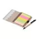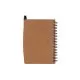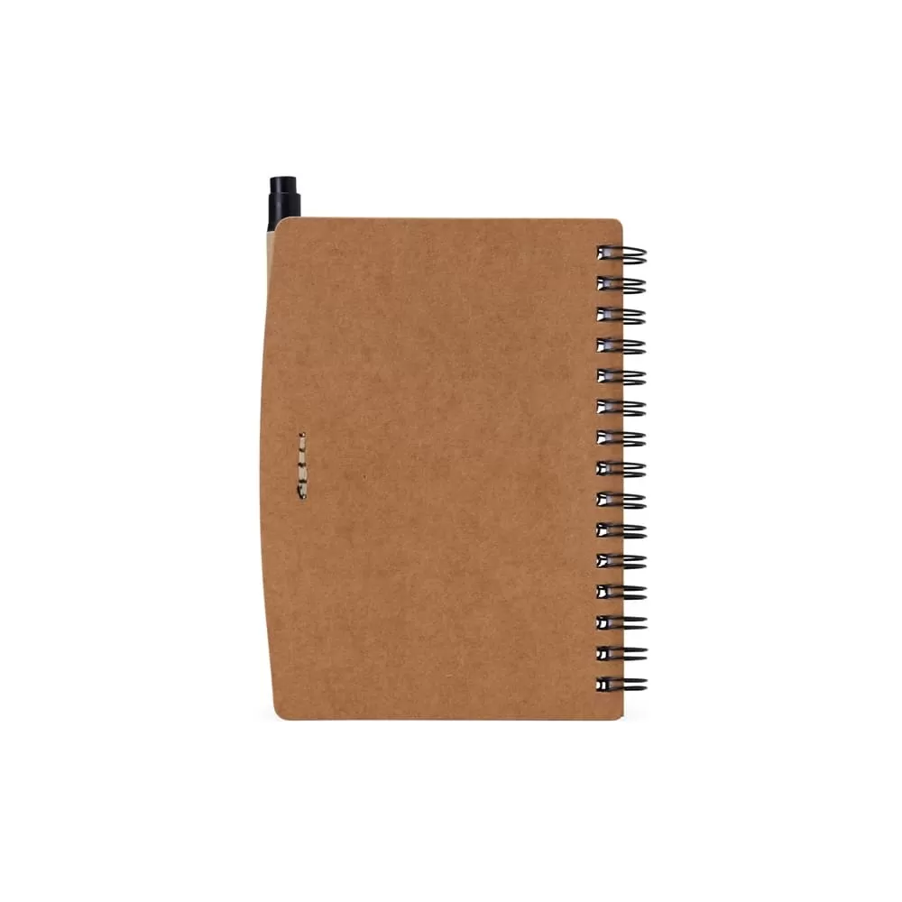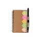 Bloco de anotações ecológico feito em papel kraft, contendo uma folha com régua de 13 cm, cinco autoadesivos com aproximadamente 13 folhas cada, e um bloco principal com cerca de 69 folhas brancas pautadas. O bloco possui um porta-caneta elástico e acompanha uma caneta feita de papelão com detalhes em plástico. A caneta possui carga de tinta azul esferográfica de 1.0mm e é acionada por clique.