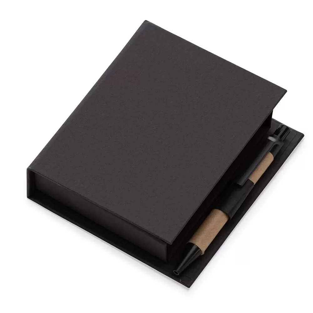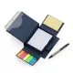 Bloco de anotações ecológico com caneta e autoadesivo. Bloco em material kraft, possui cinco blocos autoadesivos coloridos com aproximadamente 20 folhas cada, bloco amarelo com aproximadamente 25 folhas e bloco branco com aproximadamente 120 folhas. Acompanha régua plástica de 10 cm e mini caneta ecológica com detalhes em plástico.