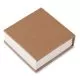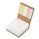 Bloco de anotações ecológico quadrado com autoadesivos. Internamente, contém autoadesivos coloridos com aproximadamente 25 folhas de cada cor, além de um bloco principal com aproximadamente 200 folhas amareladas.