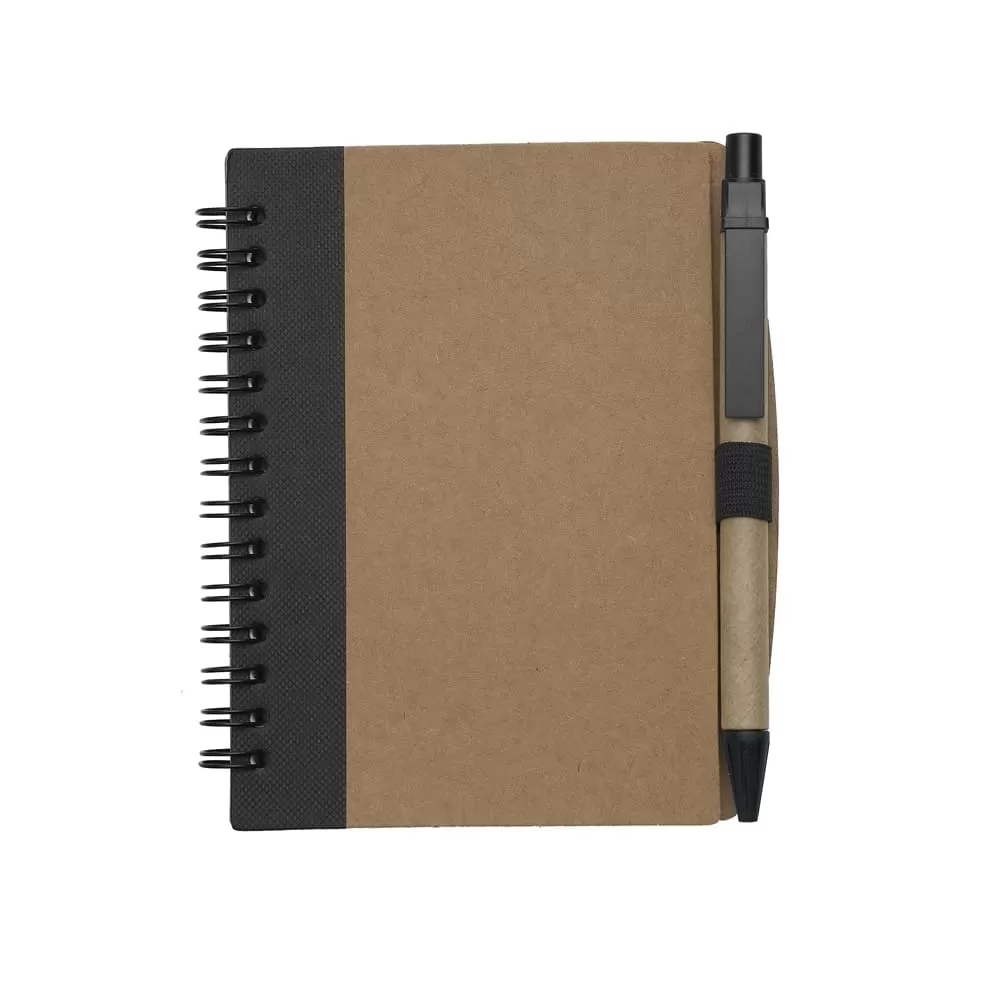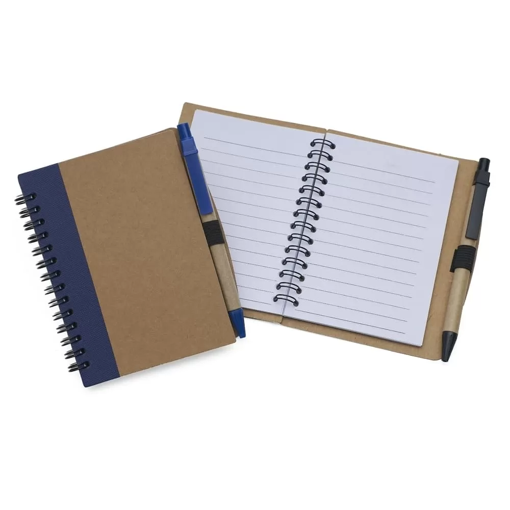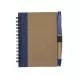 Bloco de anotações ecológico com caneta, capa produzida em papelão com detalhe lateral texturizado e verso liso. Contém miolo com folhas pautadas, suporte de nylon e acompanha caneta de papelão com detalhes plásticos, carga esferográfica na cor azul e acionamento por clique.