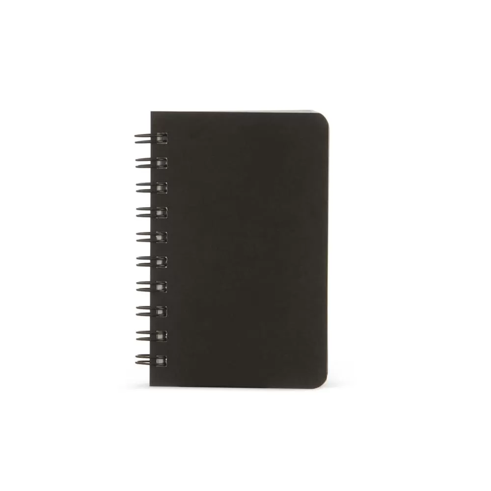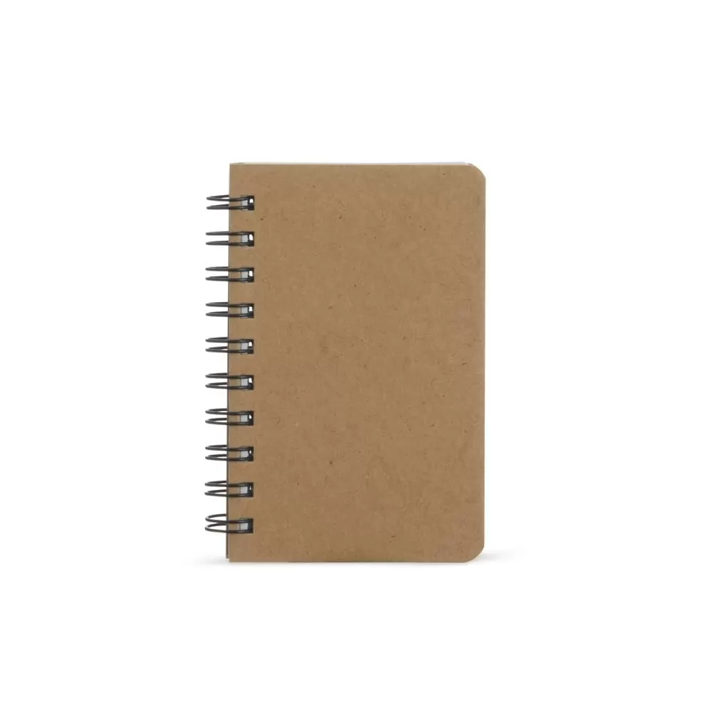 Caderneta capa dura em kraft com wire-o. Contém aproximadamente 100 folhas brancas sem pauta.