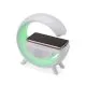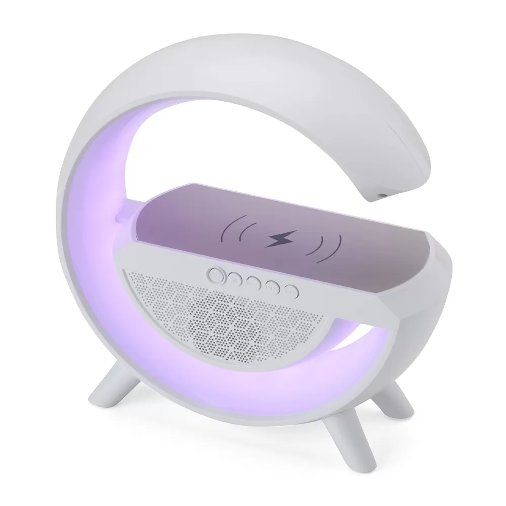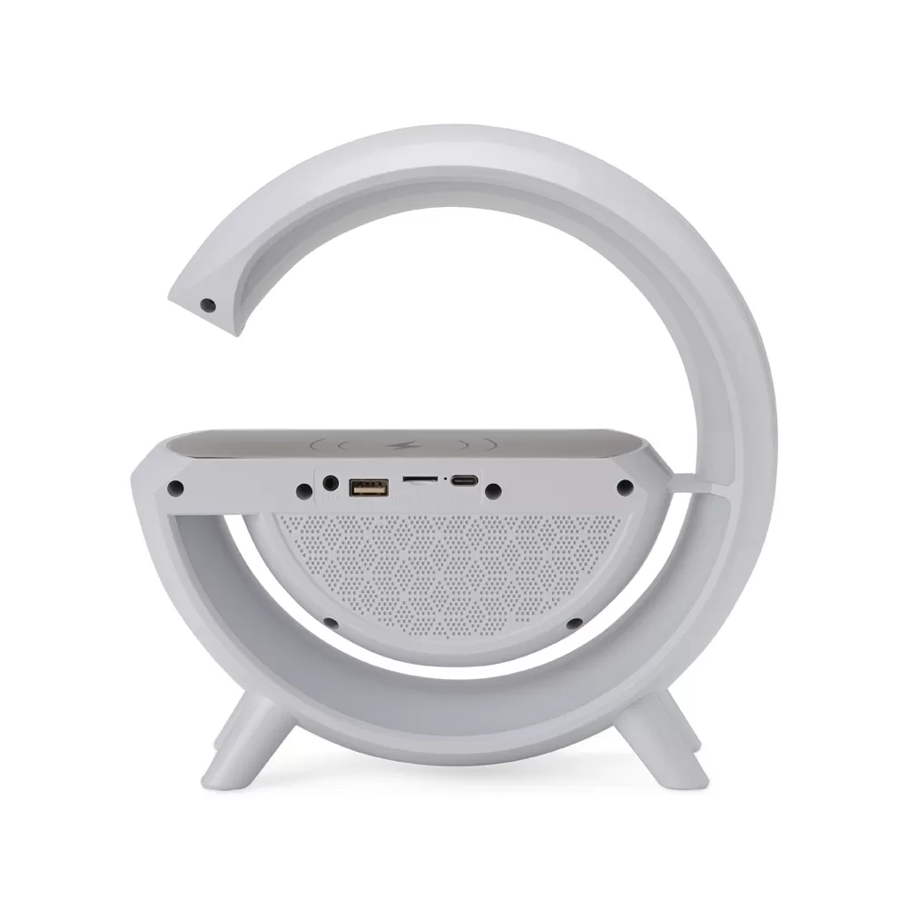 Caixa de som com carregador por indução e luminária. Possui 6 modos de iluminação, opera nos modos bluetooth, rádio FM, auxiliar P2, USB e TF (cartão MicroSD). Para desfrutar do carregamento por indução (sem fio) é fundamental que o celular possua a tecnologia QI, o produto só armazena bateria para funcionamento próprio, para funcionar a indução precisa estar conectado a uma fonte de energia.