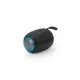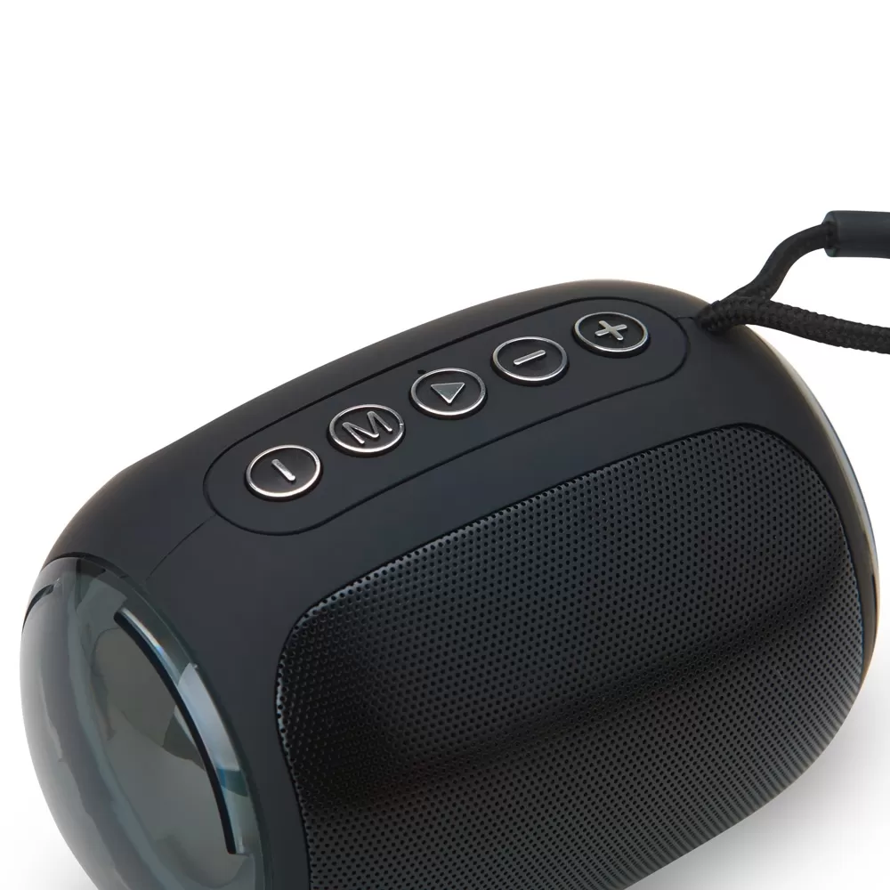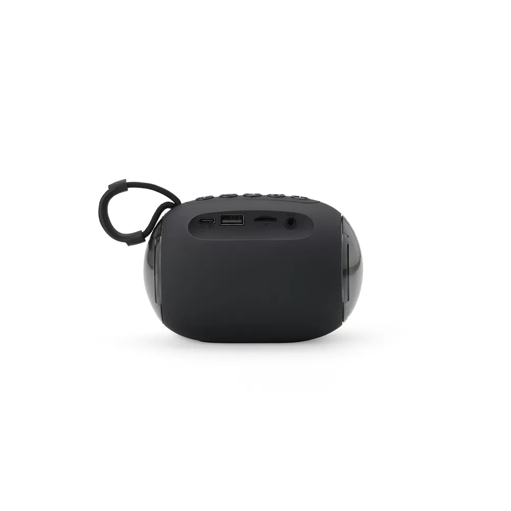 Caixa de som Bluetooth com conectividade TWS, que permite sincronizar duas caixas de som em uma, aumentando a potência sonora. Possui iluminação RGB que se ajusta conforme a batida da música, entrada para cartão TF (MicroSD), pendrive, DC 5V e entrada auxiliar P2. A base é de silicone antiderrapante. Acompanha cordão de nylon e cabo USB-V8.