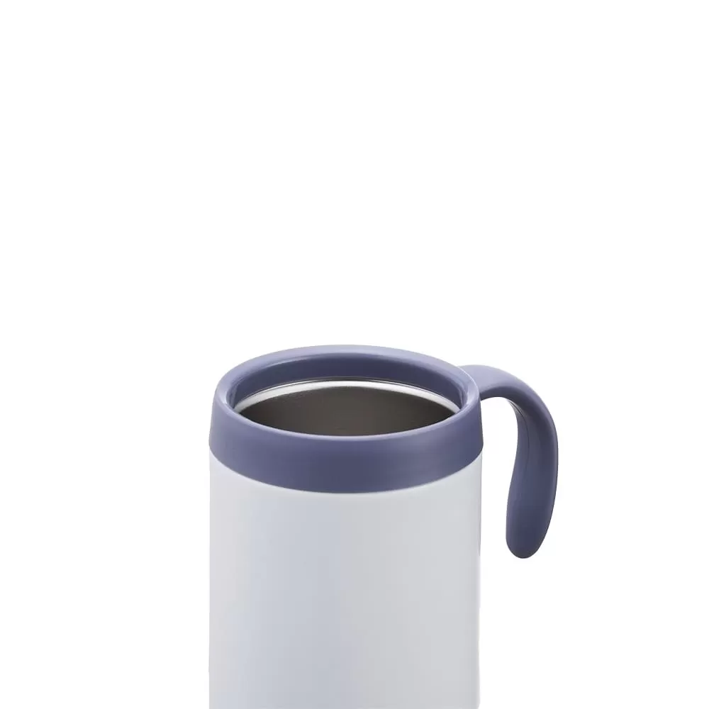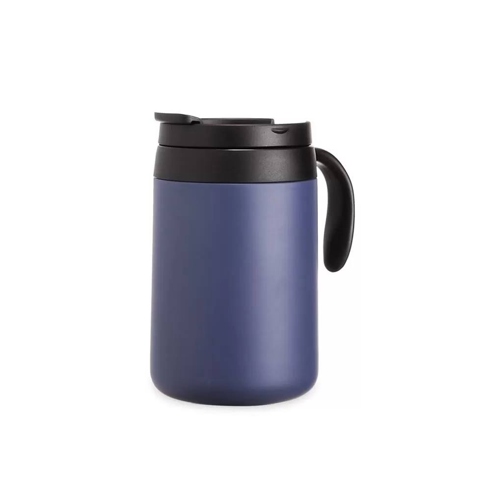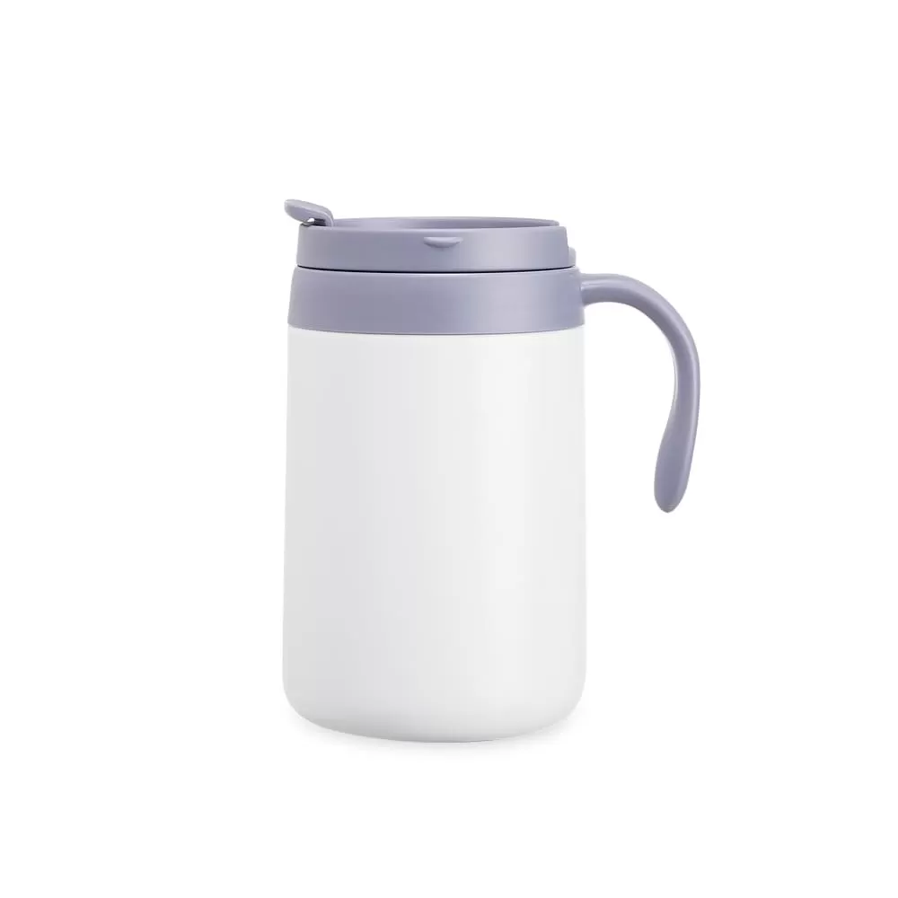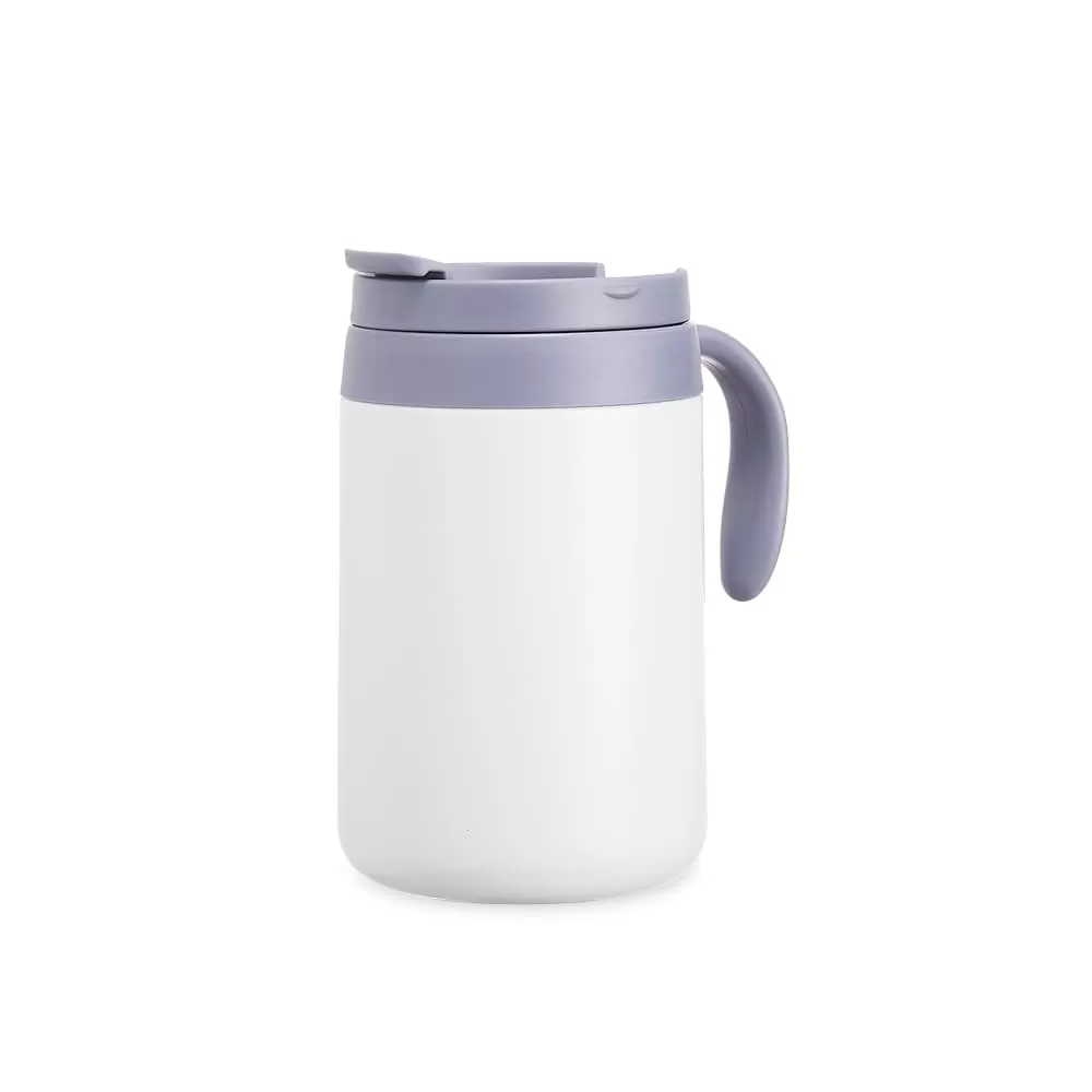 Caneca térmica feita em inox 304 com parede dupla, capacidade de 500ml. Contém tampa com acesso para o bocal, alça plástica e base antiderrapante.