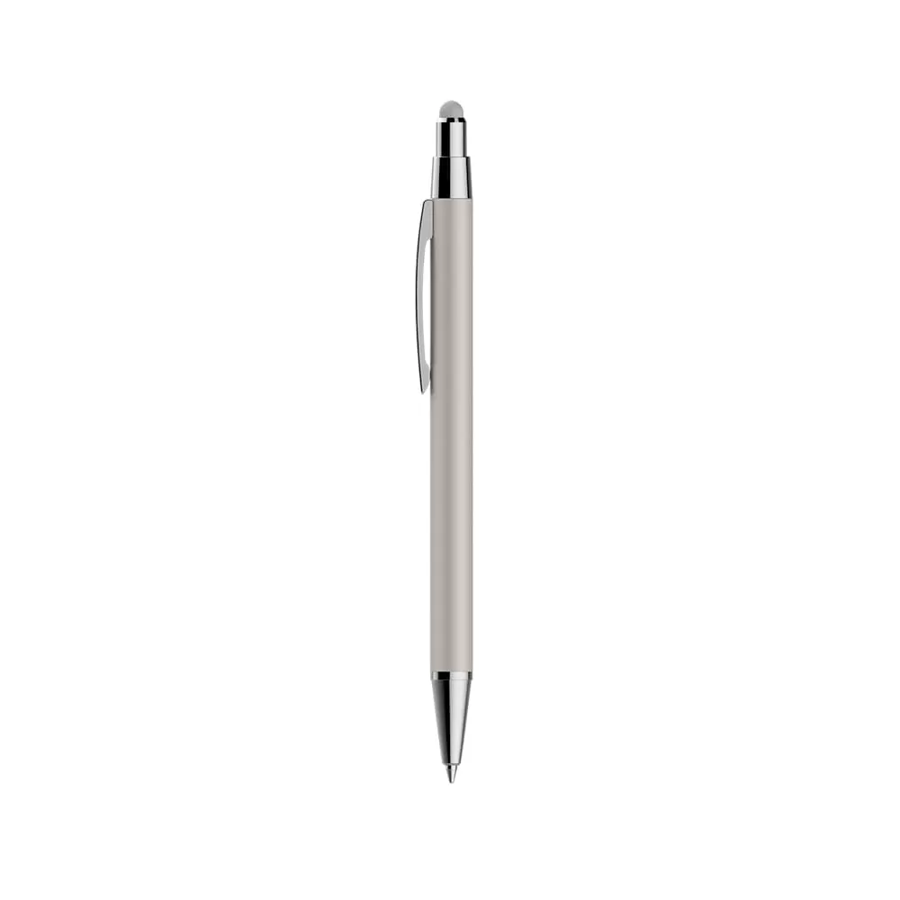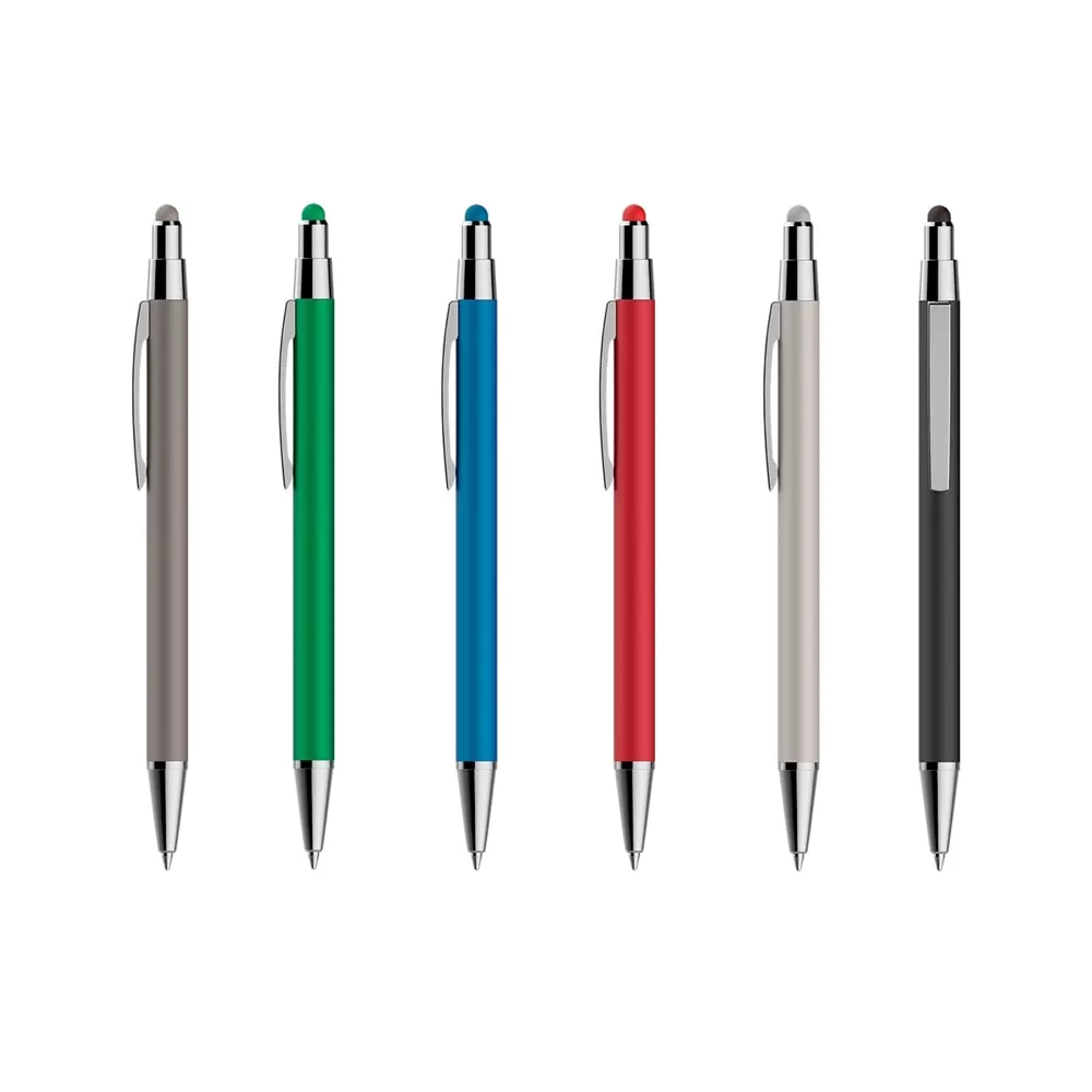 Caneta metálica com tela touch screen, carga de tinta azul esferográfica e mecanismo de acionamento por clique.
