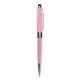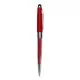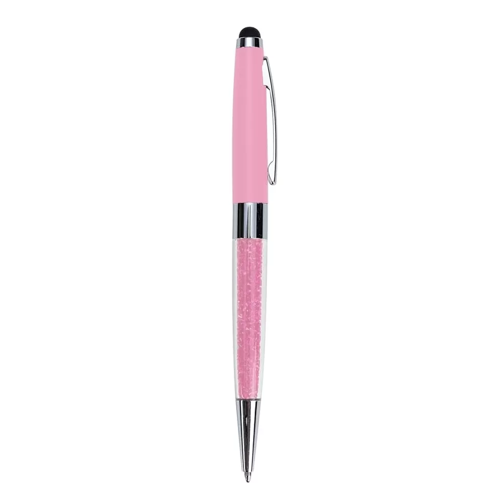 Caneta metálica com tela sensível ao toque e detalhes em cristal, com carga esferográfica azul e acionamento por rotação.