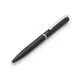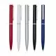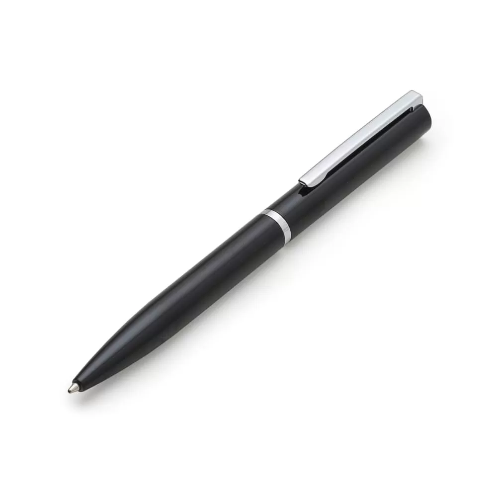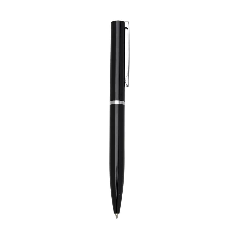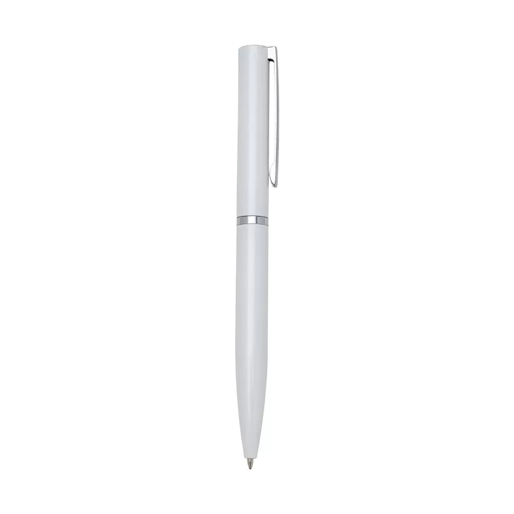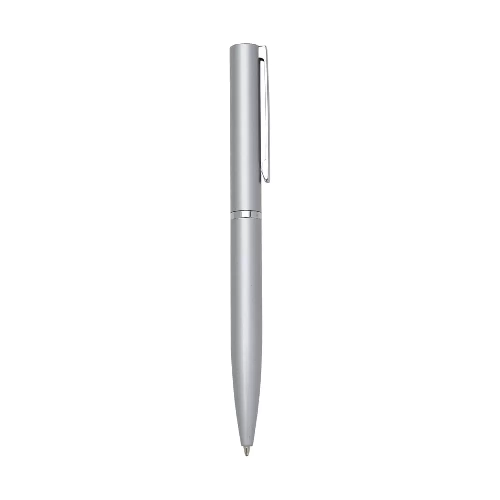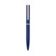 Caneta semimetálica com carga de tinta azul esferográfica e mecanismo de acionamento por rotação.