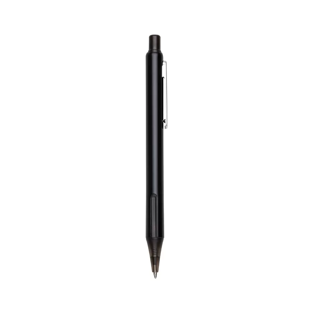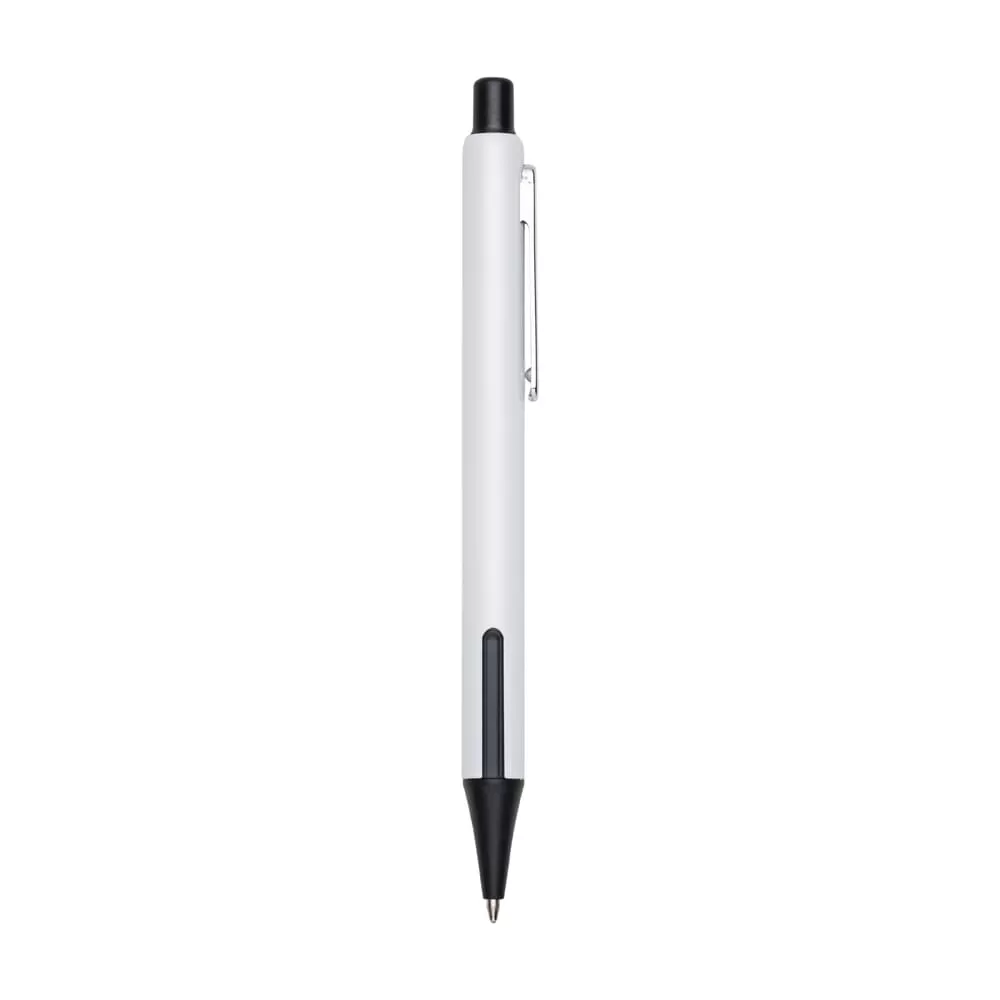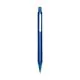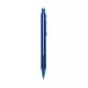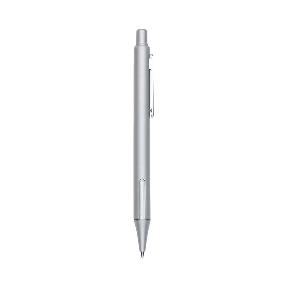 Caneta semimetálica com carga de tinta azul esferográfica e mecanismo de acionamento por clique.