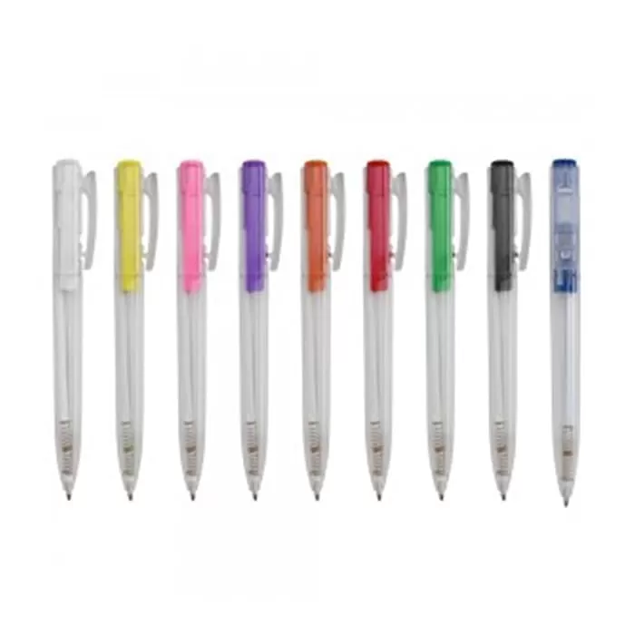 Caneta de plástico com carga esferográfica azul e mecanismo de acionamento por clique.