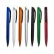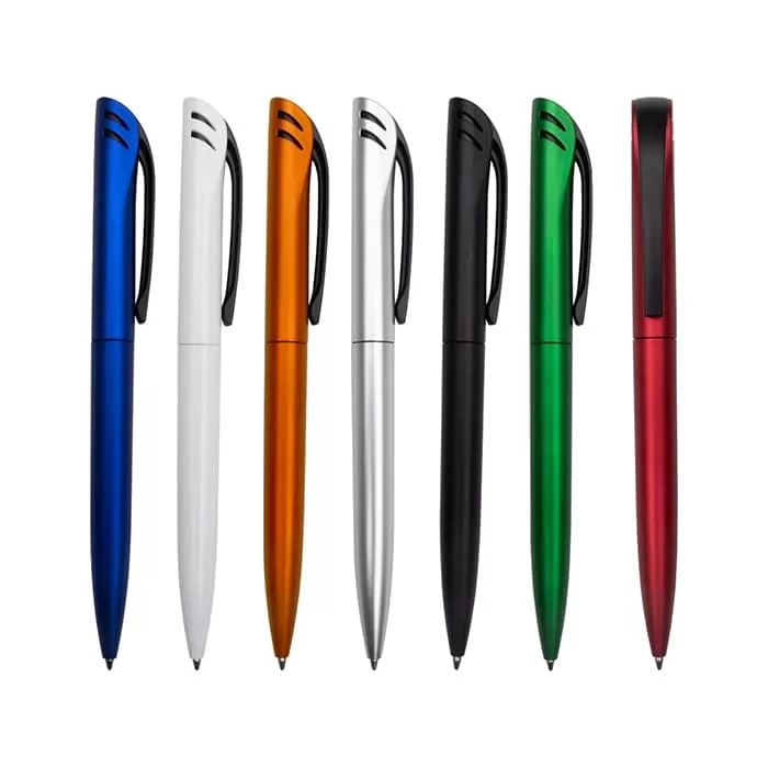 Caneta plástica com mecanismo de acionamento por rotação e carga de tinta azul esferográfica de 1.0mm.