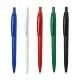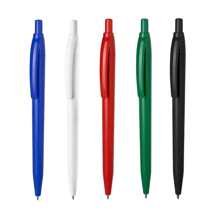 Caneta plástica com carga de tinta esferográfica azul de 1.0mm e mecanismo de acionamento por clique.
