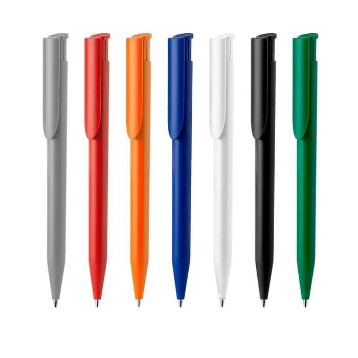 Caneta de plástico com carga esferográfica azul de 1.0mm e mecanismo de acionamento por clique.