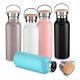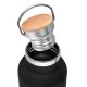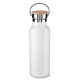 Garrafa térmica em inox 500 ml, tampa rosqueável com revestimento em fibra de bambu, alça de metal.