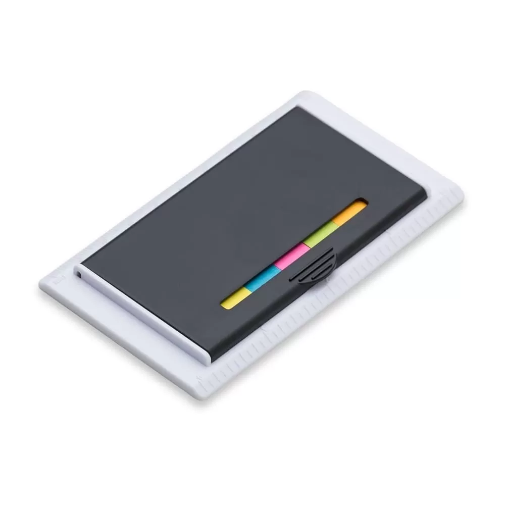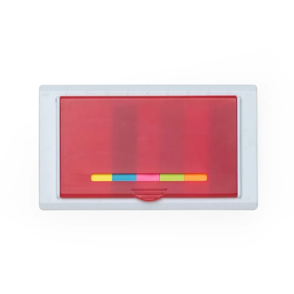 Kit autoadesivos em estojo com mini réguas e detalhe vazado na área superior, contém conjunto de sete bloquinhos autoadesivos coloridos e réguas com medições em escala de centímetros e polegadas.
