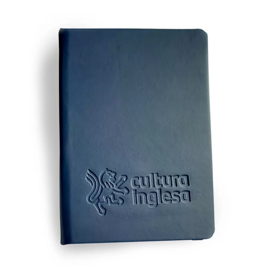 Capa dura em couro emborrachado com elástico na capa, miolo pautado e marcador de página.
