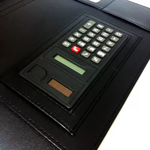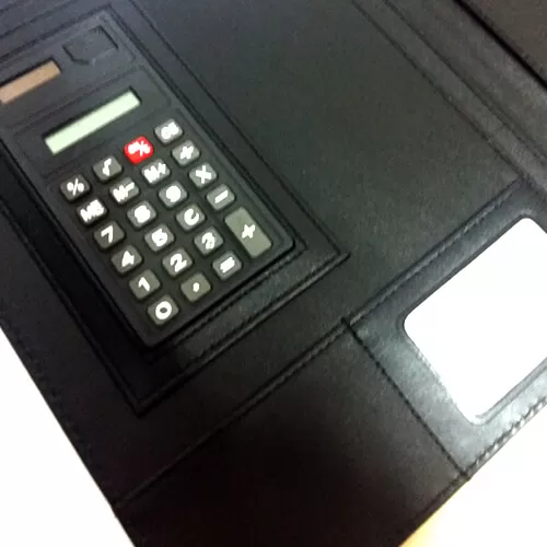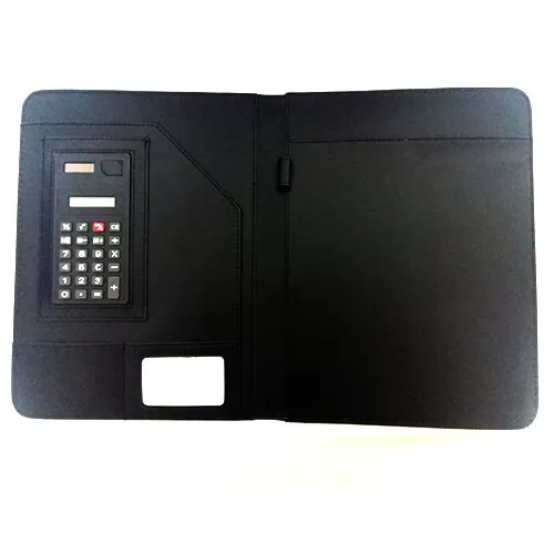 Pasta convenção com calculadora, material em couro sintético.