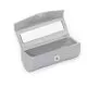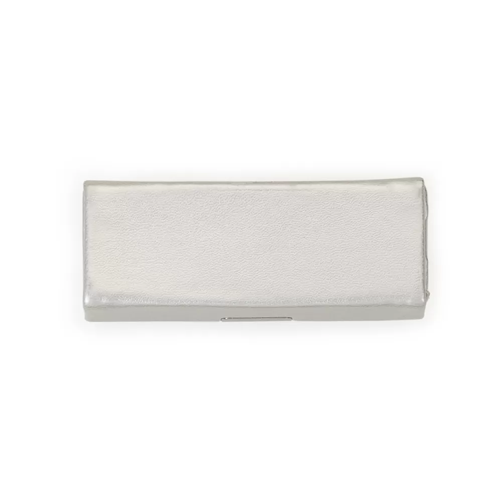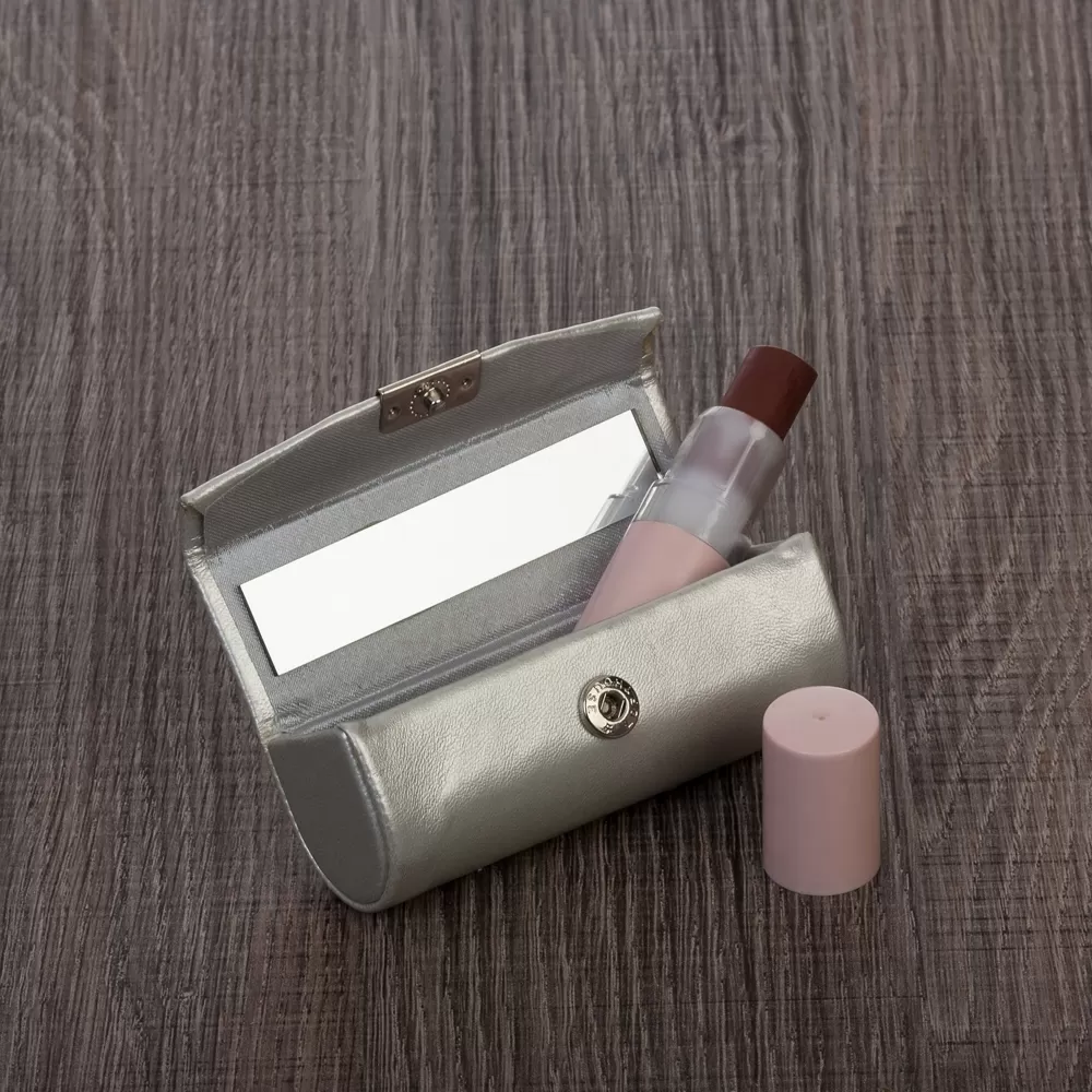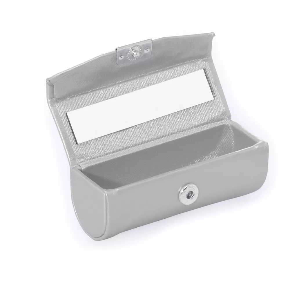 Porta batom em couro sintético prata com plaquinha de metal frontal com botão para abrir/fechar, possui um espelho interno.